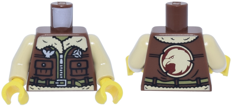 Torso Aviator Bomber Vest with Pockets, Silver Zipper, Tan Fur Collar and Lining, Olive Green Belt with Buckle, Pins, Eagle Head on Dark Red Circle on Back Pattern / Tan Arms / Yellow Hands