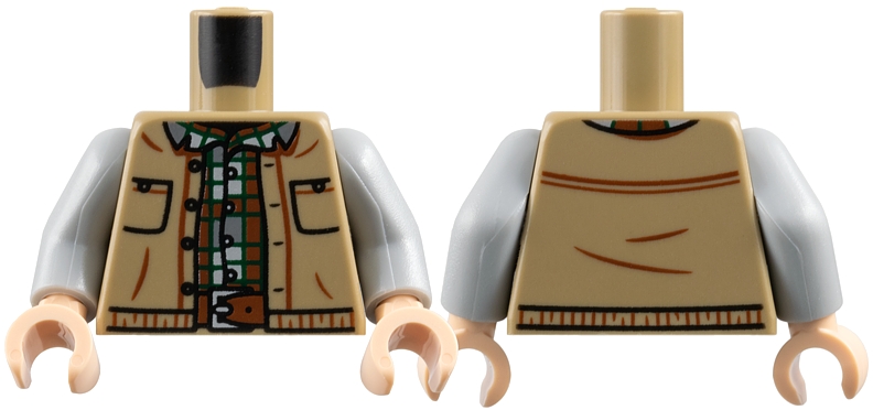 Torso Vest Open with Pockets, Reddish Brown, Dark Bluish Gray, Light Bluish Gray and Dark Green Plaid Shirt, Belt with Silver Buckle Pattern / Light Bluish Gray Arms / Light Nougat Hands
