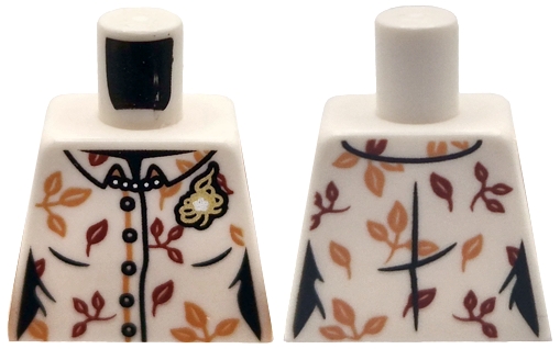 Torso Female Button Up Shirt with Nougat and Dark Red Leaves, Silver Pearl Necklace, Gold Brooch Pattern