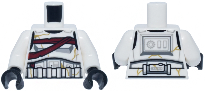 Torso SW Armor Stormtrooper, Simplified Armor with Shoulder Belts, Dark Red Bandages Around Chest, Gold Cracks Pattern / White Arms / Black Hands