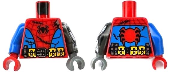 Torso Spider-Man Costume, Dark Red Webbing, Black Spider and Stitches, Blue Panels, Utility Belt with Buckle, Pouches and Grenades Pattern / Pearl Dark Gray Arm Left with Armor and Grenades Pattern / Blue Arm Right / Dark Bluish Gray Hand Left / Red Hand Right