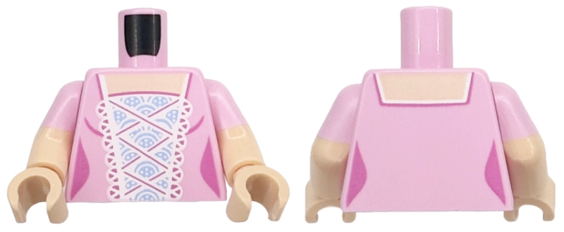 Torso Female Bodice Dress, Light Nougat Neck, White Lace Trim, Bright Light Blue Center Panel with Dark Pink Details Pattern / Light Nougat Arms with Molded Bright Pink Short Sleeves Pattern / Light Nougat Hands