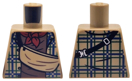 Torso Plaid Shirt Open with Blue Lines, Shoulder Bag with Black Strap, Reddish Brown Undershirt and Dark Red Scarf Pattern
