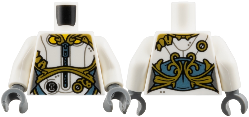 Torso Female Jumpsuit, Metallic Light Blue Zipper and Waist, Gold Trim Pattern / White Arms / Dark Bluish Gray Hands