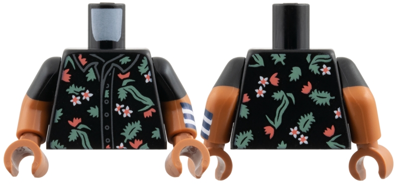 Torso Button Up Shirt with White and Coral Flowers, Sand Green Leaves Pattern / Sienna Arm Left with Molded Black Short Sleeve and Printed Dark Blue and White Wristband Pattern / Sienna Arm Right with Molded Black Short Sleeve Pattern / Sienna Hands