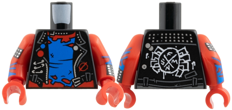 Torso Biker Vest, Silver Trim, Belt Buckle and Safety Pins, Tattered Blue Shirt over Red Chest, Painted White Spider on Back Pattern / Red Arms with Blue Zigzags, Black Cuff with Silver Studs Pattern / Red Hands