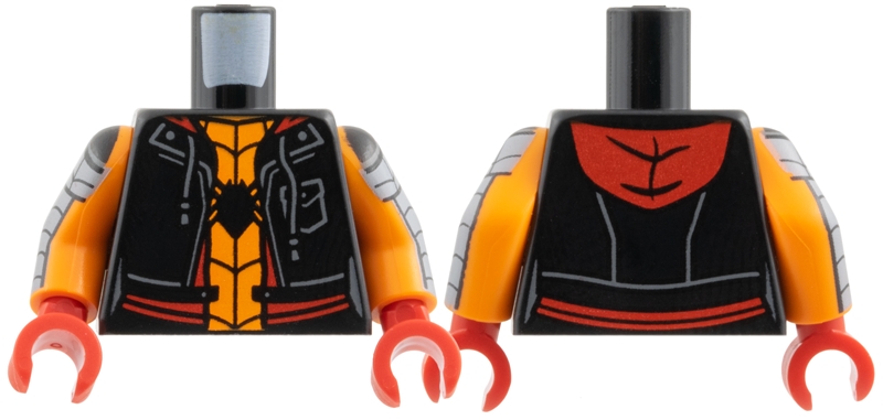 Torso Hoodie Vest with Pocket and Drawstrings, Red Trim and Hood, Orange Shirt, Black Spider and Webbing Pattern / Orange Arms with Dark Bluish Gray Armor and Black Webbing Pattern / Red Hands