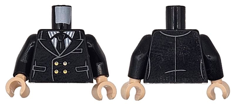 Torso Tuxedo Jacket with Pockets over White and Dark Bluish Gray Pinstripe Shirt, Tie and Gold Buttons Pattern / Black Arms / Light Nougat Hands