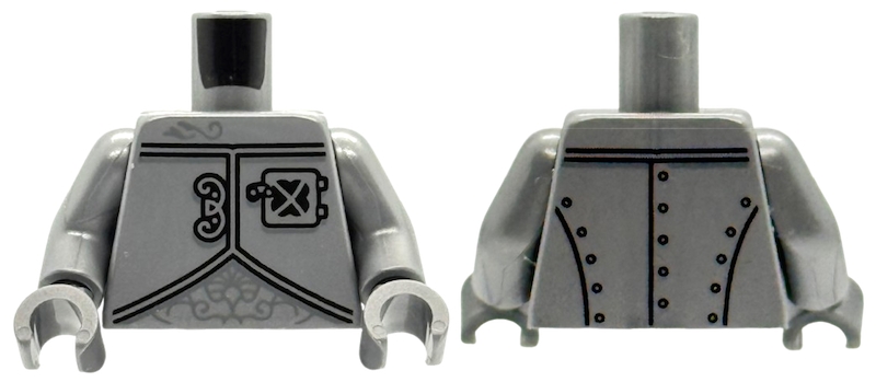 Torso Armor with Black Clasp, Hatch and Rivets, Dark Silver Ornate Symbols Pattern / Flat Silver Arms / Flat Silver Hands