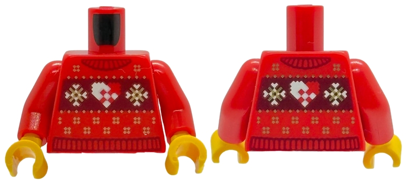 Torso Knit Fair Isle Holiday Sweater with Dark Red Collar, Trim and Panel, Gold and White Snowflakes and Heart Pattern (BAM) / Red Arms / Yellow Hands