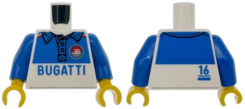 Torso Shirt with Buttons, Blue Collar and Panels, Black and Dark Bluish Gray Stitching, Red and Silver Bugatti Logo and '16' Pattern / Blue Arms / Yellow Hands