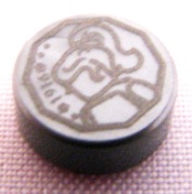 Tile, Round 1 x 1 with Female Minifigure Silhouette Head and Shoulders and '1916' in Decagon Coin Pattern