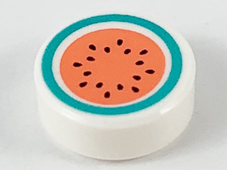 Tile, Round 1 x 1 with Coral Watermelon with Dark Turquoise Circle Rind and Black Seeds Pattern