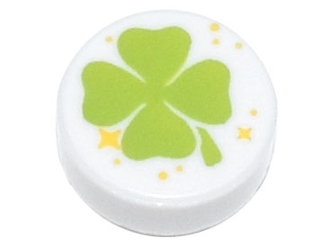 Tile, Round 1 x 1 with Lime Four-Leaf Clover and Yellow Sparkles Pattern