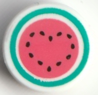 Tile, Round 1 x 1 with Coral Watermelon with Dark Turquoise Circle Rind and Black Seeds in Heart Shape Pattern