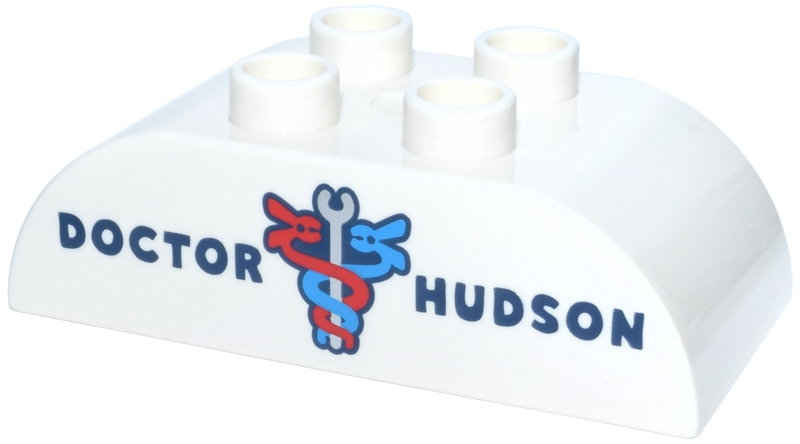 Duplo, Brick 2 x 4 Slope Curved Double with Dark Blue 'DOCTOR HUDSON' Silver Wrench and Red and Dark Azure Caduceus-Shaped Jumper Cables Pattern