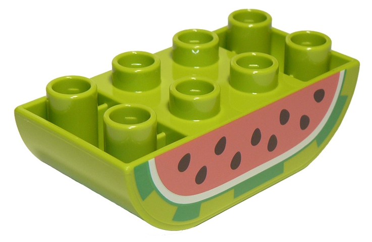 Duplo, Brick 2 x 4 Slope Curved Inverted Double with Black Seeds on Coral Background, Cut Watermelon Pattern