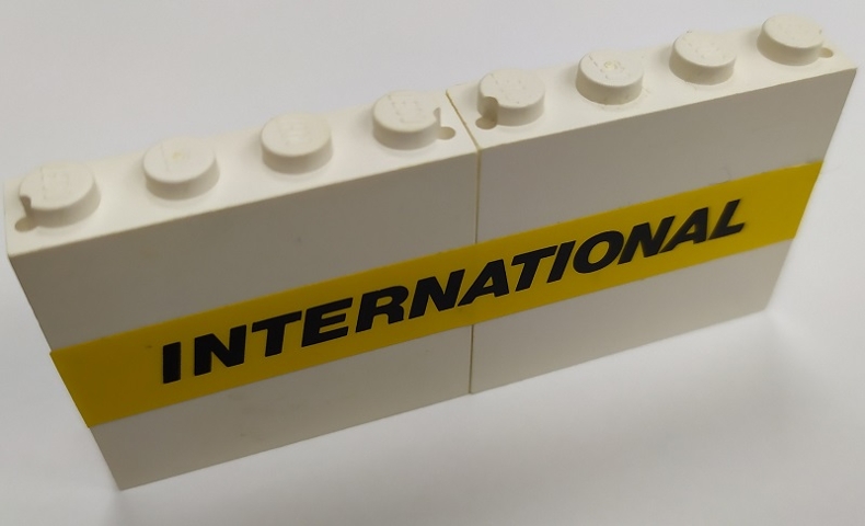 Stickered Assembly 8 x 1 x 3 with Black 'INTERNATIONAL' on Yellow Stripe Pattern (Sticker) - Set 6367 - 2 Panel 1 x 4 x 3 - Solid Studs
