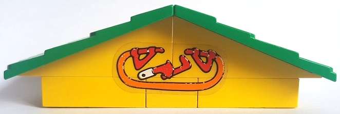 Stickered Assembly 12 x 4 x 3 1/3 with Pipe Wrench and Gas / Fuel Pump with Hose Pattern (Sticker) - Set 3670 - Fabuland Roof Support Slope, 6 x 2 with Green Fabuland Roof Slope without Chimney Hole, 1 Brick 2 x 2 without Inside Supports, 2 Brick 2 x 4
