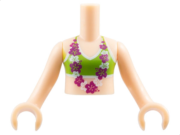 Torso Mini Doll Girl Lime Bikini Top and Lei with Magenta and White Flowers Pattern, Light Nougat Arms with Hands