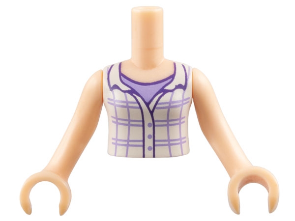 Torso Mini Doll Girl White Plaid Button Top Sleeveless with Open Collar over Lavender Shirt Pattern, Light Nougat Arms with Hands