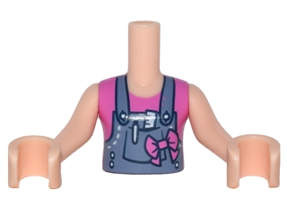 Torso Mini Doll Girl Sand Blue Overalls with Ruler and Pen in Pocket over Dark Pink Sleeveless Shirt, Bow Pattern, Light Nougat Arms with Hands