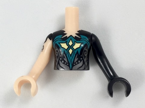 Torso Mini Doll Girl Black Top, Jagged Neckline Pattern, Black Arm with Hand Left, Light Nougat Arm with Hand and Black Tattoo Right