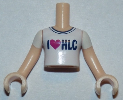 Torso Mini Doll Girl White T-Shirt with 'I Heart HLC' Pattern, Light Nougat Arms with Hands with White Short Sleeves