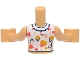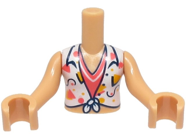 Torso Mini Doll Girl White Knotted Blouse with Dark Blue, Coral and Bright Light Orange Lines and Shapes over Shirt Pattern, Medium Tan Arms with Hands