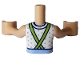 Torso Mini Doll Girl Bright Light Blue Overalls with Black Pocket and Lime Straps over White Shirt with Magenta Dots Pattern, Medium Tan Arms with Hands