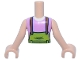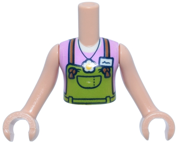 Torso Mini Doll Girl Lime Overalls, Medium Nougat Straps, White Flower Pendant and Name Tag Over Bright Pink Sleeveless Top Pattern, Light Nougat Arms with Hands