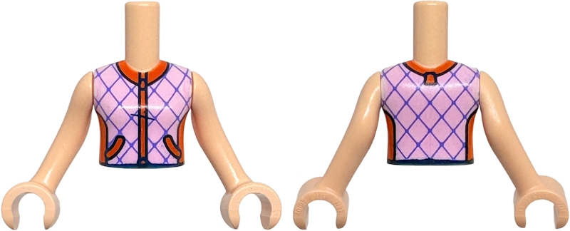 Torso Mini Doll Girl Bright Pink Sleeveless Jacket with Dark Purple Diamond Shapes, Reddish Orange Collar, Pockets, Zipper and Insets with Dark Blue Edges Pattern, Light Nougat Arms with Hands