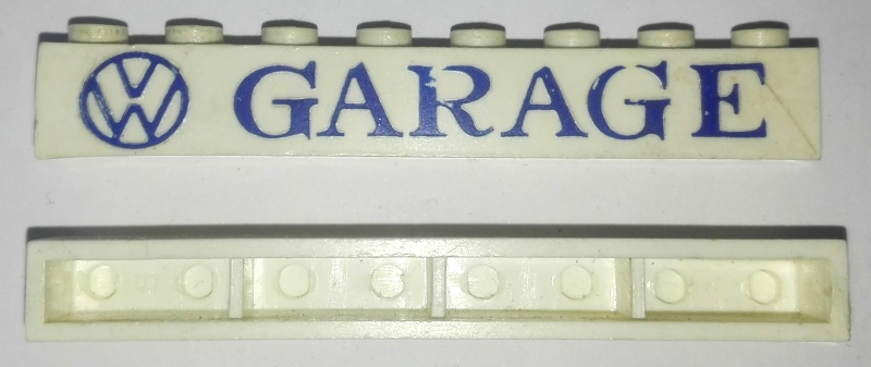 Brick 1 x 8 without Bottom Tubes with Cross Side Supports with Blue 'VW GARAGE' Large Pattern