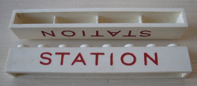 Brick 1 x 8 without Bottom Tubes with Cross Side Supports with Red 'STATION' Thin Large Pattern