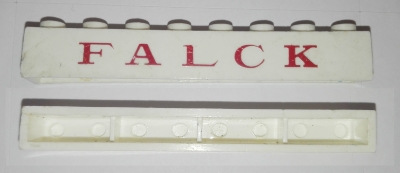Brick 1 x 8 without Bottom Tubes with Cross Side Supports with Red 'FALCK' Serif Thin Pattern