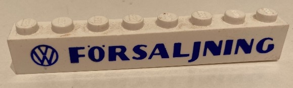 Brick 1 x 8 without Bottom Tubes with Cross Side Supports with Blue VW Logo and 'FÖRSÄLJNING' Bold Pattern {FORSALJNING}
