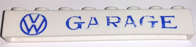 Brick 1 x 8 without Bottom Tubes with Cross Side Supports with Blue 'VW GARAGE' Small Pattern
