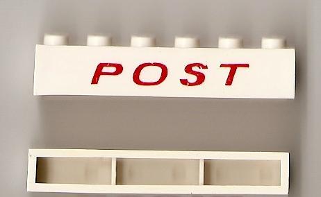 Brick 1 x 6 without Bottom Tubes with Cross Side Supports with Red 'POST' Thin Slanted Pattern