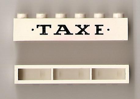 Brick 1 x 6 without Bottom Tubes with Cross Side Supports with Black 'TAXE' and Dots Small Pattern