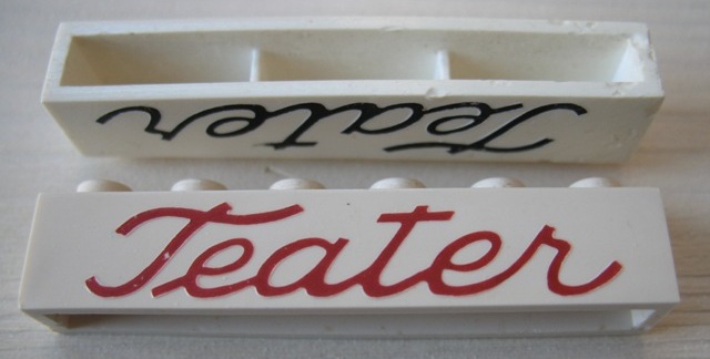 Brick 1 x 6 without Bottom Tubes with Cross Side Supports with Red 'Teater' Script Pattern