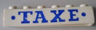 Brick 1 x 6 without Bottom Tubes with Cross Side Supports with Blue 'TAXE' and Dots Bold Pattern