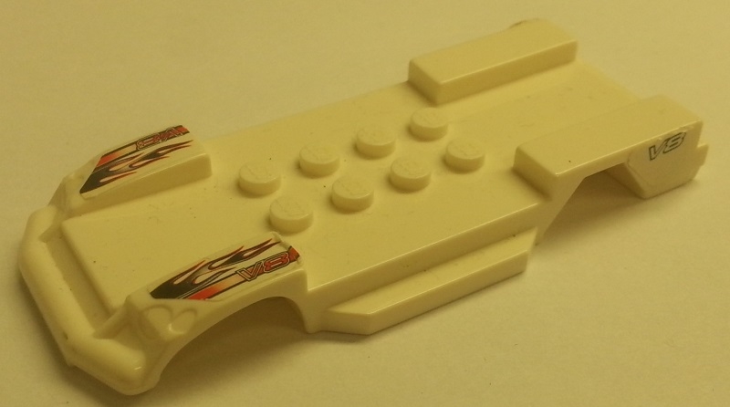 The former part title was Vehicle, Mudguard Fast Food Racer 4 x 10 with Headlights and Side Sills with Flames and 'V8' Pattern (Stickers).