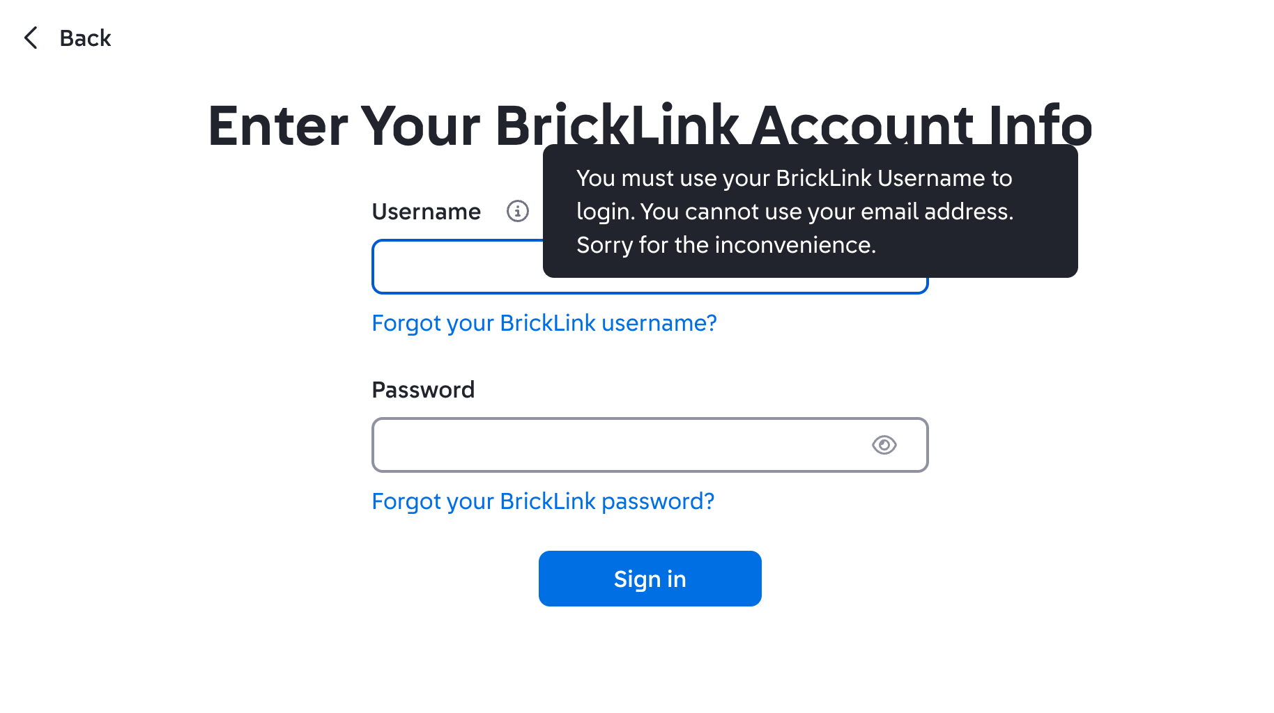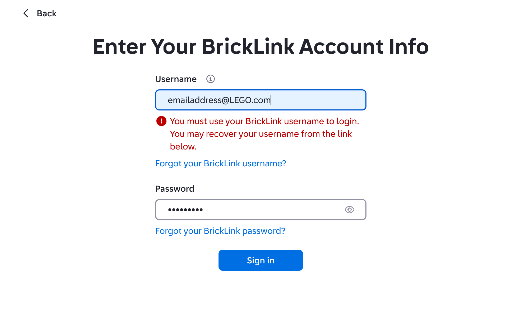 Sign in After the account integration on September 18th, 2025, BrickLink members will no longer sign in using the email address associated with their BrickLink account. Instead, you’ll sign in to both LEGO.com and BrickLink.com using your LEGO username.