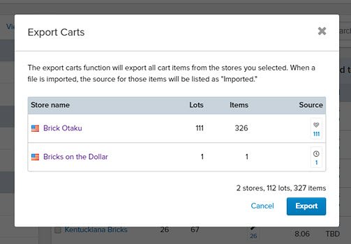 Använd import och export funktionerna för att dela kundvagnar med andra BrickLink användare. När en kundvagn exporteras omvandlas den till en .cart fil som bara kan användas på BrickLink.