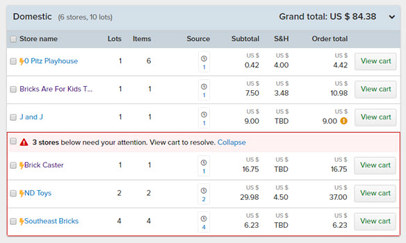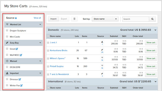 | Den nya Globala Kundvagnen låter dig med enkelhet hantera flera BrickLink butikers kundvagnar. Använd den globala kundvagnen för att snabbt lösa problem med artiklar i kundvagnar, filtrera artiklar efter källa, avgöra om du har pågående kundvagnar i stängda butiker och med enkelhet flytta tillbaka artiklar till önskelistan. |