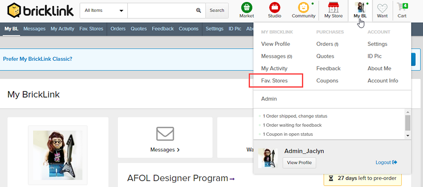 Klik op de Fav. Stores (= favoriete shops)link in het Mijn Bricklink menu bovenaan iedere pagina om toegang te krijgen tot My Favorite Stores.