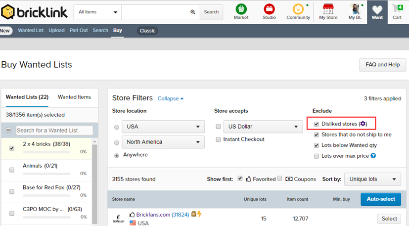 Je kunt de optie gebruiken om te koop aangeboden items van shops die op je Least Favorite Stores lijst staan niet te laten zien in je Search Settings. Je kunt er ook voor kiezen om de niet geliefde shops van je zoekresulataten te verijderen als je de Buy Wanted Lists mogelijkheid gebruikt.