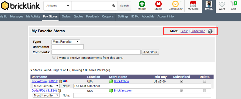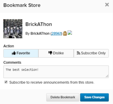 Je kunt BrickLink bshops toevoegen aan je Favorite Stores (=Favoriete Shops) lijst. Je kunt deze link ook gebruiken om in te schrijven voor shop mededelingen