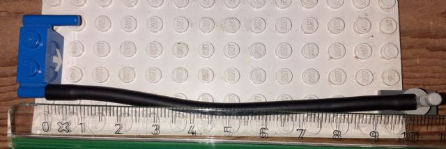 The hose in my copy of the set is 77mm (slightly under 10 studs) in length.