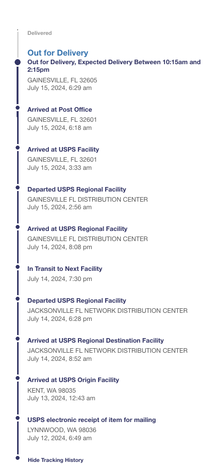 USPS Priority Mail Service from Washington to Florida. Dropped-off this morning